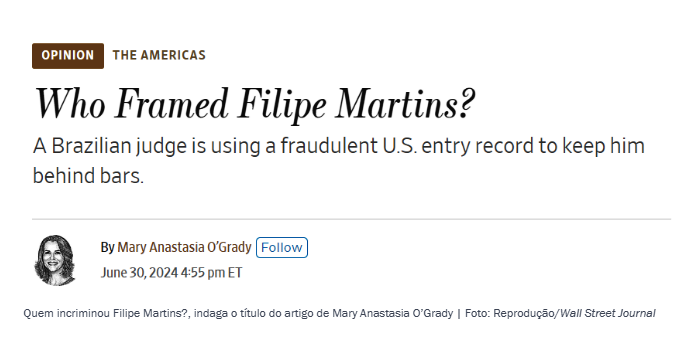 Em um artigo publicado neste Domingo (30/6) no jornal norte-americano Wall Street Journal, a colunista Mary Anastasia O’Grady afirmou que o ministro do Supremo Tribunal Federal (STF), Alexandre de Moraes, “está usando um registro fraudulento de entrada nos Estados Unidos para manter Filipe Martins atrás das grades”.