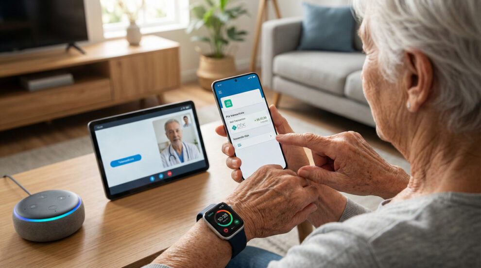 No setor financeiro, a adesão ao Pix é massiva. Levantamento de 2025 já mostrava 72% dos idosos utilizando a ferramenta regularmente, atraídos pela simplicidade do QR Code e do “copiar e colar”. Bancos digitais responderam com telas limpas e letras grandes, forçando instituições tradicionais a rever suas plataformas.