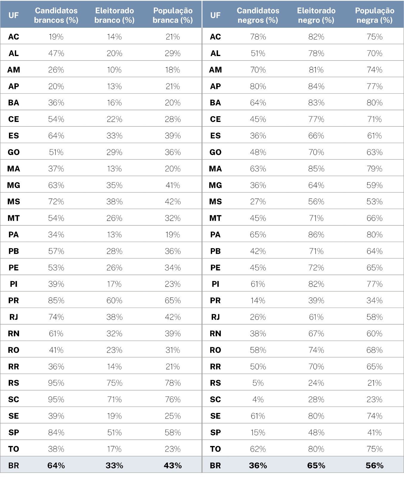 O estudo apresenta a declaração de raça dos candidatos, suas características e a comparação com os estratos populacionais de raça. Enquanto a maioria dos candidatos se declararam brancos, o Censo Demográfico de 2022 revelou que a população autodeclarada como branca é de 43%. Já em relação aos candidatos negros, classificação do IBGE que abarca os pretos e pardos, enquanto o percentual de candidatos é de 36%, a representação da população é de 56%.